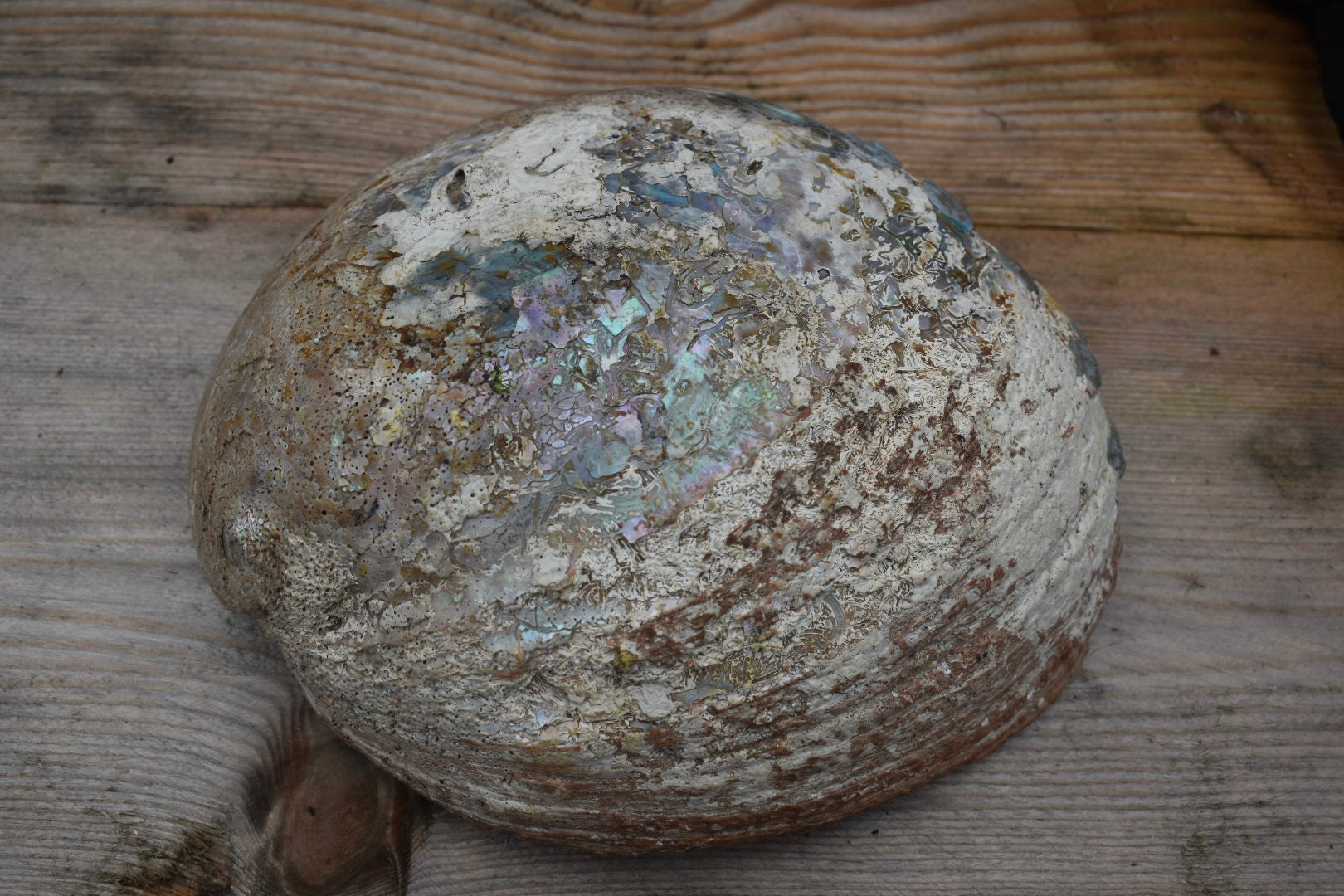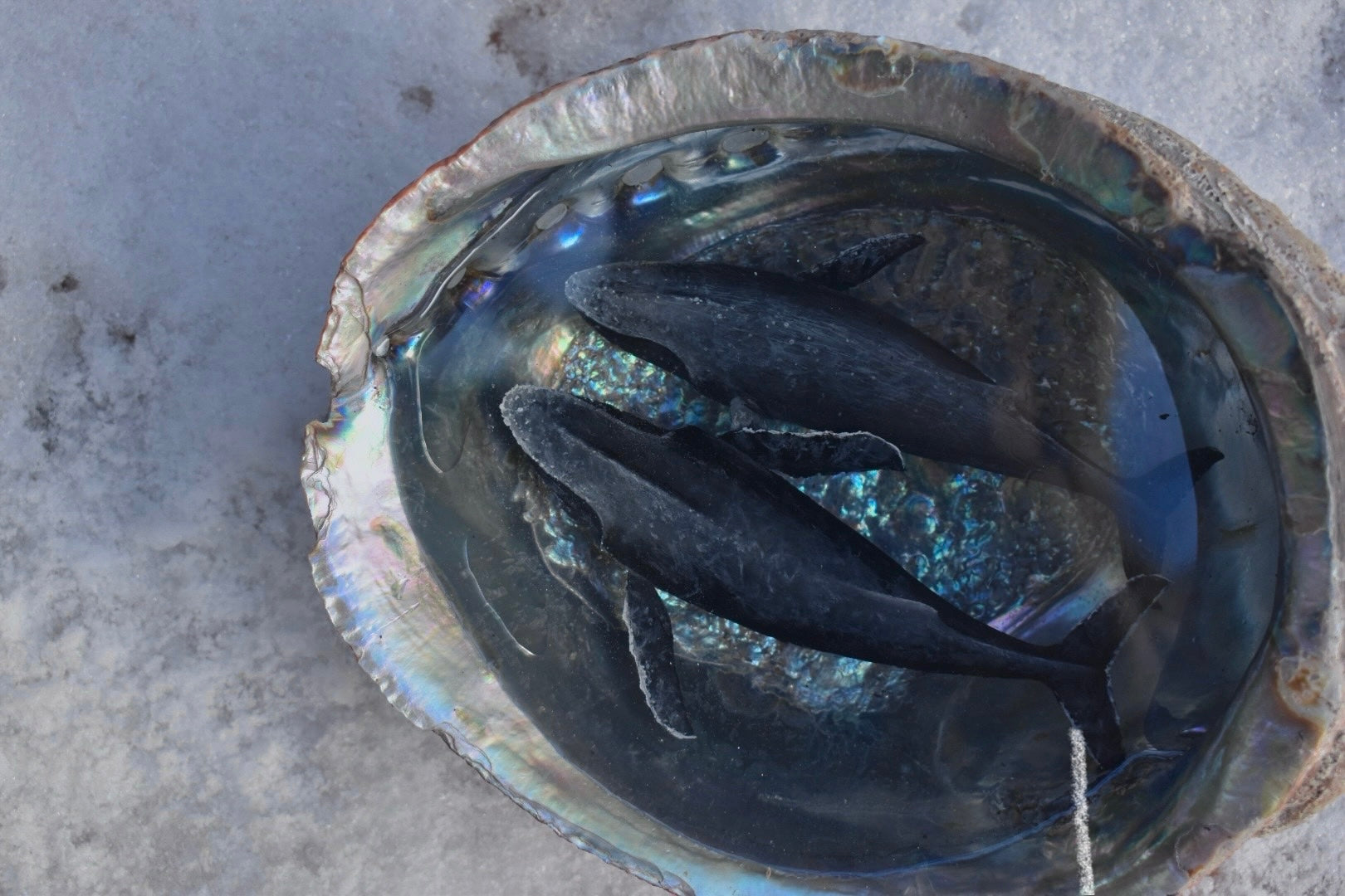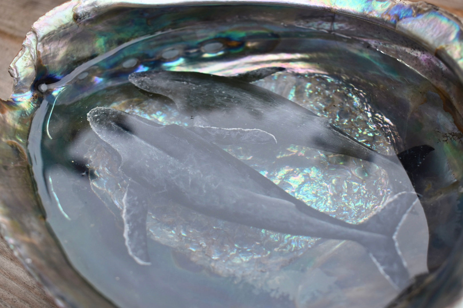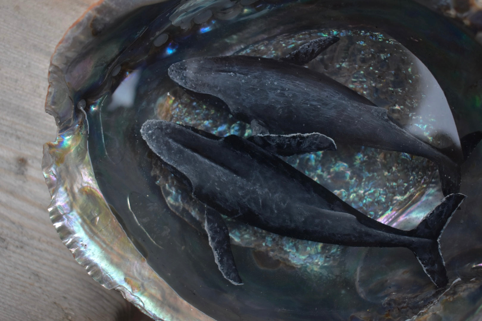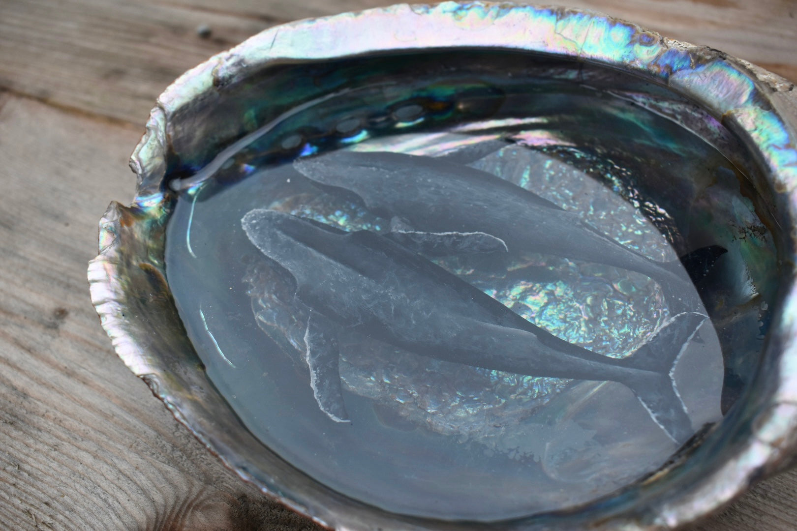 Acrylic paint submerged in clear resin inside XL sized silver blue abalone shell